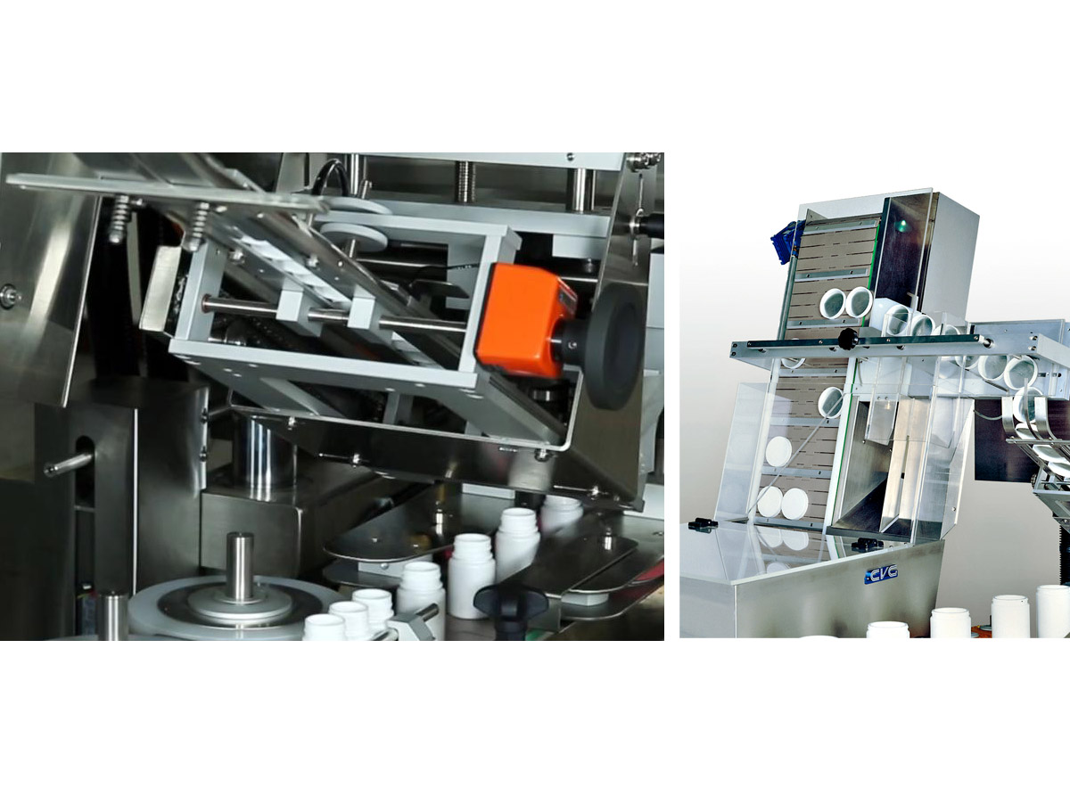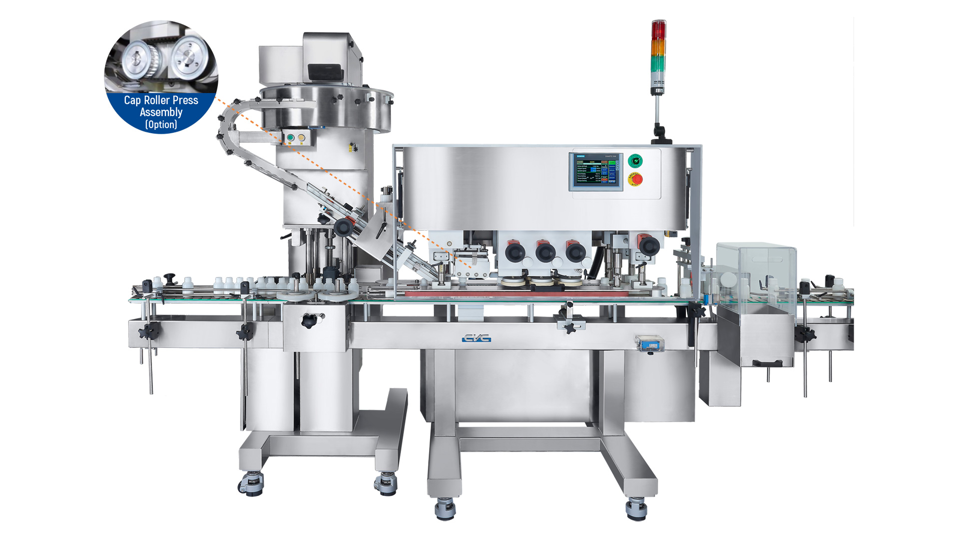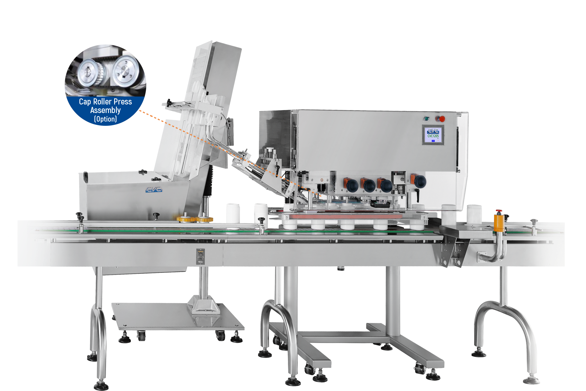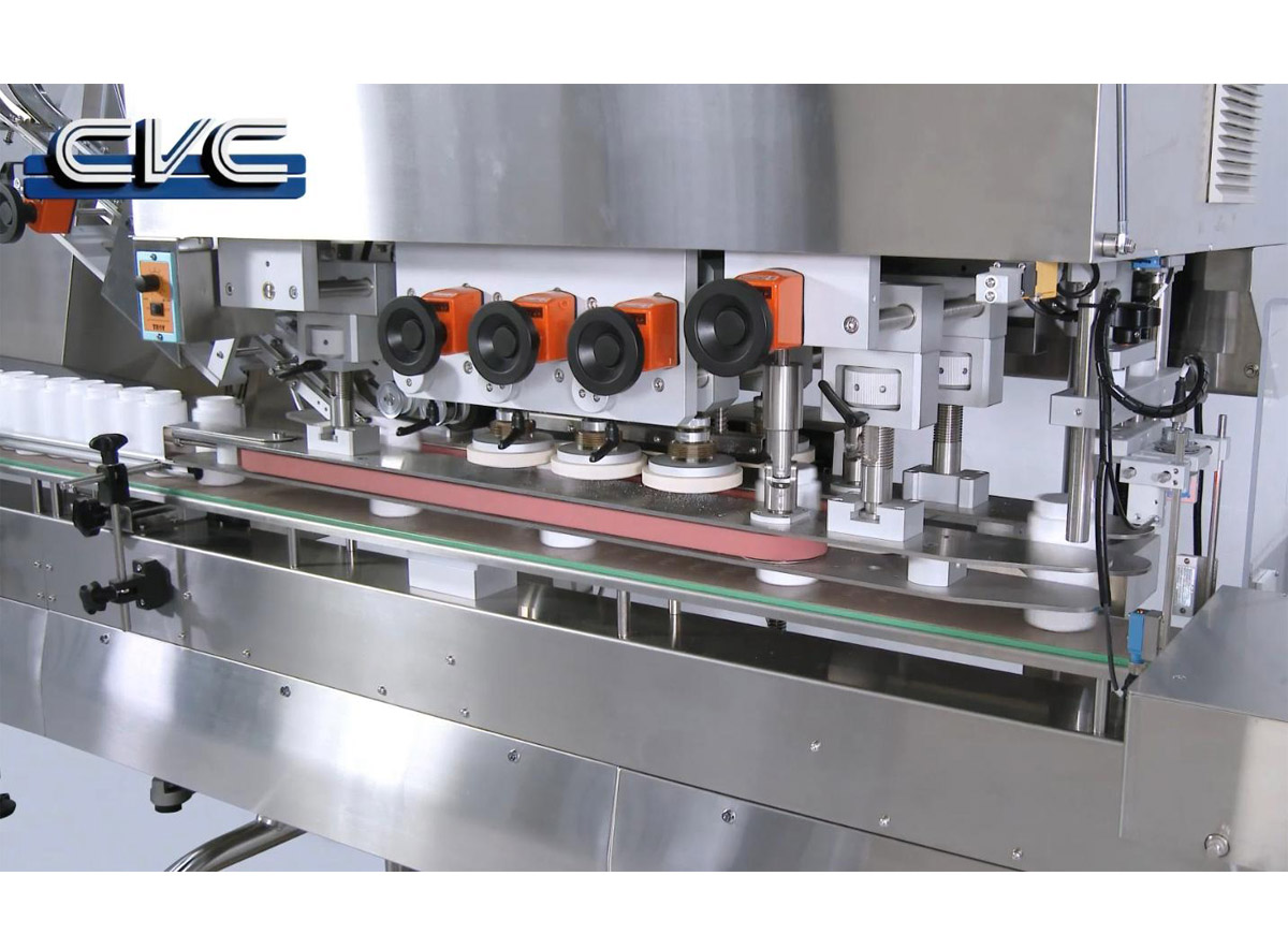 The CVC 1205 Capper is a very flexible machineThe CVC 1205 Capper is a very flexible machinedesigned to apply and tighten screw-on capsonto containers at rates of up to 120 bottles perminute. The CVC 1205 is Siemens PLC controlled. Options include tower lamp, hopper level control, cap inspection (level cap, foil seal, and no cap), reject, and reject verification.