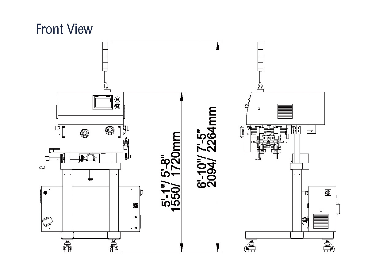 The dimensions shown are for standard machine. The conveyor can be extended: the length may var y based on selected options. This machine can run independently or be integrated into an automated packaging line. All CVC equipment is covered by a one-year par ts warranty. Full Warranty details are included in our equipment proposals or can be found on our website.